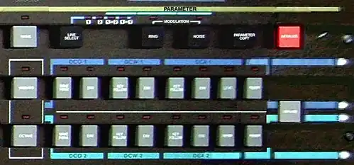 The DCA (which determined how loud a given oscillator was at a given moment) was also modulated by another dedicated 8-stage envelope generator. The DCW and DCA also had a "key follow" feature; which determined how much higher notes affected a sound, making the DCW have a more dull sound with less harmonics with higher notes, and making the DCA envelope faster for higher notes.