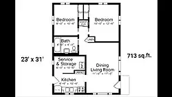 The Cassidy House is one of only 24 Lustron Newport homes ever manufactured by the Lustron Corporation.[3] The Newport was a two bedroom, one bath home. The total square footage of the home is 713 square feet. Unlike the earlier Westchester models, the Newport had gas forced air heating. The Newport was also known as model 023. It is significantly less common than the Lustron Westchester model. The original color of the Cassidy House was surf blue.[4] The Cassidy House was repainted in 2021 to closely match the original color.