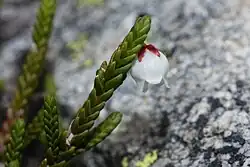 Cassiope mertensiana has short, erect, snakelike stems that are covered in tiny leathery scalelike leaves only a few millimeters long. From between the layers of scale leaves emerge reddish pedicels each bearing a petite, hanging, down-facing, bell-shaped flower. The bractlets are red and the contrasting flower is white.