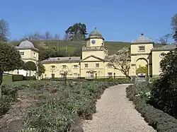 The house is surrounded by landscaped grounds containing many picturesque structures and decorative points-de-vue. The former include three small classical-style Greek temples, the Sunrise Temple (1831), the Sunset Temple (1831) and Satyr's Temple (1861); the Traveller's Cross, erected in 1831, but formerly situated on a roadside near North Aller; Ugley Bridge (1861), an imitation of an old Devon packhorse bridge; The Sybils' Cave (1861), filled in while the house served as a home for evacuated children during World War II, but since re-opened. The ancient parish church formerly situated next to the former pre-Palladian manor house was demolished in 1732 by Lord Clinton with the licence of Stephen Weston, Bishop of Exeter, and was rebuilt to a new design in its present position some 1 mi (1.6 km) to the west of the house, visible from the terrace. This made available an unencumbered site for the planned landscaping. Other points-de-vue include the Sham Castle, the Triumphal Arch, the Ebrington Tower and the Sham Village (now demolished).