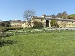 The stable block, viewed from the east. The main vehicular entrance to the house is through the large arch along a road which passes directly in front of the service block, the clock tower of which can be seen behind. The main range is visible to the left (south).
