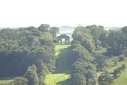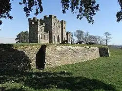 The Ebrington Tower was built in 1992 by Lady Margaret Fortescue on the site of the former Sham Village. The tower was built in memory of her only brother Viscount Ebrington, 21, who was killed in 1942 in action with the Royal Scots Greys at the Battle of El Alamein in Egypt, and whose mural memorial marble tablet can be seen in the Fortescue Chapel in Filleigh Church. Due to his loss, on the death of his father the 5th Earl in 1958, the family titles passed by law to the latter's younger brother, but in the absence of an entail, the Castle Hill and Weare Giffard estates he was free to bequeath to his two daughters. The tower, made from local stone, consists of three stories and is crenellated on top. It was designed by Hal Moggridge who had organised much of the reparatory landscaping work following the great storm of 1990, and was built by Graham Davey.[8]