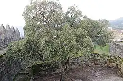 The keep tower, surmounted by merlons, is 10 metres (33 ft) high and is accessible by an arched doorway 3 metres (9.8 ft) above the ground.[1] The line of walls circle the terrain within which is the alcalde's citadel and a large cistern.[1] The vestiges of the old citadel include its foundations and towers at the angles and part of an accessway, that allude to the pre-Roman relief.[1] Internally, the rectangular space includes two lines of pillars.[1]