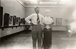 The committee included a "special feature" of "modern art, the only stipulation being that works of art, as well as all other exhibits, must relate in some way to Castlemaine or its district," and called for "historical curios, weapons, maps, manuscripts, medals, trophies, or any other article of local significance".[9] An early supporter was Elioth Gruner.[10] The exhibition thus established the principle of collecting of Australian art and of looking locally, for works connected to Castlemaine in some aspect,[11] in contrast to a policy of concentrating on British and European art that was pursued by most Australian galleries of the period, in particular the National Gallery of Victoria purchases in Europe by L. Bernard Hall through the Felton Bequest.[12][13]