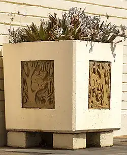 The entry steps are Harcourt granite, the parapet of Malmsbury bluestone, and Barker's Creek slate pave the forecourt, on which rest two cuboid planters decorated with panels showing native animals in a sympathetic style by textile artist and sculptor Michael O’Connell who also provided planters and ornaments to Buda's garden.[37]
