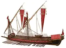 The Catalan galley (formerly galea) was a type of ship powered by oars and the wind. Depending on the purpose, it could serve as a warship or as trade ship. It was mentioned in the 13th century by Corominas in his Diccionario crítico etimológico de la lengua castellana,[10] who references a Catalan galley in the year 1120 AD (100 years earlier than all neighboring countries).[11][12]