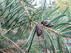 The leaves are needle-like, 2.5–5.5 cm (1.0–2.2 in) long, have ciliate (hairy) margins when young, and grow around the stems in a spiral pattern. The cones are 3–5 cm (1.2–2.0 in) long, with about 15–20 scales, each scale bearing two winged seeds.[3]