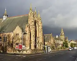 Cathcart contains several churches including Cathcart Baptist church, Cathcart United Free church, Cathcart Congregational church and two Church of Scotland churches; Cathcart Old and Cathcart Trinity. The present Cathcart Old building was opened in 1929 and sits across Carmunnock Road from the earlier churchyard which contains the tower from the previous church and a graveyard. Cathcart Trinity was formed in November 2002 from the union of the vacant charges of Cathcart South and New Cathcart. The former New Cathcart Church building was converted into housing in 2006.[10][11] Cathcart's Catholic residents are served by St Gabriel's Church in Merrylee and by Christ the King in King's Park. Three congregations of Jehovah's Witnesses share a Kingdom Hall in Cathcart.
