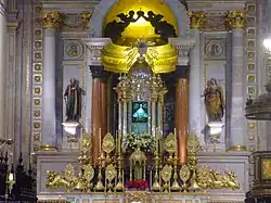 The miracle working image of the Virgin of San Juan de los Lagos is located under a canopy, a beautifully crafted niche with a circular floor plan supported by Ionic columns. Under this canopy, the metal and glass case that houses the image is covered with a raised silver dome that culminates at the top with the figure of the Holy Spirit, made by the goldsmith Epitacio Garabito.