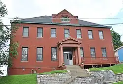 The convent is influenced by the Colonial Revival style. It features a hipped roof and an entrance portico with Doric columns and capitals. The school building is similar in style with the convent. It is a two-story brick building that at-one-time had a third floor that has since been removed.