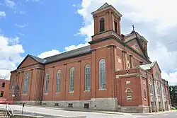 The building features a transept and two corner towers on the main façade with pyramidal roofs. The church's main building was originally roofed with Ludowici Spanish tile, before later being replaced.[5] The narthex, featuring three entrance doors was added in 1956. The rectory is a three–story brick structure. "The facade features three-story, projecting box bay and side, two-story, projecting polygonal bays."[4] The L-shaped porch is supported by Romanesque-style columns. The auditorium features Art Deco elements on its design from the 1950s.