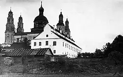 During the World War II the dungeons of the cathedral were used by Rodionov's collaborators as a prison for their prisoners.[35][50] The church building was partially damaged during the war: in 1944 the wooden drum with the dome and the upper levels of the towers were burned,[20][2] many icons, the altar and the church archives were damaged.[50][42] Unlike the church itself, which was covered with iron roofing, the towers were rebuilt, but in a reduced form.[1] After the war, the monastery buildings were used as an oil factory, later as a zonal archive, and the dungeons of the church itself were used as a warehouse of the Hlybokaye canning factory.[2][35][50]