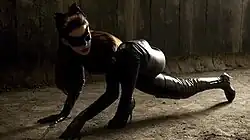- Selina Kyle appears in The Dark Knight Rises, portrayed by Anne Hathaway.[38][39] Entertainment Weekly describes Hathaway's portrayal as an enigmatic, wily, and witty con artist, as well as a high society grifter. Moreover, Hathaway believed that she was auditioning for Harley Quinn.[40] Prior to Hathaway's casting, Natalie Portman, Eva Green, Keira Knightley, Kate Mara, Gemma Arterton, Blake Lively, and Lady Gaga were considered for the role.