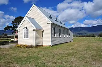 Additional buildings were constructed on the Methodist church's land. These buildings included a cottage and two buildings used as a shop and a post office.[4] The shop and post office buildings were rented out from c.1900 to c.1940. A hall, noted for its fine timber lining, was built in 1921.[5] A public swimming pool, built with local volunteer labour, opened in 1957. It was extended in 1980 with the addition of a tennis court and in 2001 when gas barbeques were added.[note 3] The pool is a 16-metre (52 ft) outdoor pool and is managed by the Caveside Recreation Committee.[10] The shop has long closed but the Caveside memorial hall remains open and is operated by the Meander Valley Council.[11] The Church of Christ formed an organisation in the area in 1909. Prior to this services had been held in Caveside. They built a hand-split timber church building and opened it in 1911. The original building was moved in 1956 and a replacement built.[7] The building is now known as "The Church in the Paddock".[12]