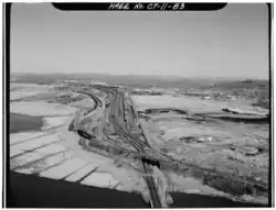 In 1969, the bankrupt New Haven Railroad was merged into newly-formed Penn Central Transportation Company, which inherited the yard. Soon after, Penn Central shut down the western hump at the yard, leaving only one hump in operation.[16] That same year, electrified operations were discontinued, and the catenary in the yard was dismantled.[38][39] Under Penn Central, the yard was largely in a state of decay. The retarders in the yard had never been upgraded or replaced since their installation in 1929, and were no longer able to apply enough force to cars to slow them. The employees came up with a solution that was dubbed the 'toothpick machine': workers in the yard placed pieces of wood ("toothpicks") on the rails in front of each car, to reduce their speed as they went down the hump. A 1974 U.S. Senate report assessing issues in agricultural transportation opined that "Considering the price of new lumber these days, it is quite possible a new retarder would be cheaper."[40] On June 12, 1973, another trestle in the yard was destroyed by a fire. The trestle was part of a freight bypass that connected to the line towards Hartford from the north end of the yard. Penn Central was forced to route northbound trains from the yard through the city of New Haven until the trestle could be repaired.[41] Operations at Cedar Hill were severely impacted by a fire on the Poughkeepsie Bridge in May 1974, which suspended all traffic between New Haven and points west that travelled across the bridge via the Maybrook Line.[42] The bridge remained closed despite a directive to reopen it from Malcolm Wilson, the Governor of New York, later that year.[42][43] Plans for rebuilding the bridge were repeatedly delayed, with New York representative Benjamin Gilman calling the situation a "seminar on government procrastination".[43] A legal fight over the fate of the bridge continued for years, with Connecticut's congressional delegation opposed to the federal plan to abandon the bridge and route freight to Cedar Hill via a circuitous route through Albany, New York, and Springfield, Massachusetts. A representative of the Connecticut Department of Transportation (CTDOT) observed that freight shipments between Washington, D.C., and Boston increased in time from 6 hours to 31 hours when traveling this inland route.[44]