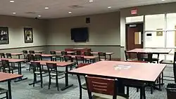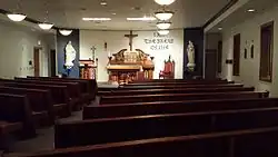 Enclosing more than 100,000 square feet[11] with a capacity for 500 students,[64] the school building is divided into two wings.[11] The academic wing contains sixteen classrooms, four science labs, two art labs, computer lab, and the student center. The social wing is bounded on one end by the 1400-seat Cvengros Gymnasium and on the other by the performing arts center - a 560-seat auditorium, audio lab, band room, and chorus room. Between are a 100-seat chapel, cafeteria, commons area, faculty dining area, welcome center, main office, weight room and four locker rooms.[11][15][62]
