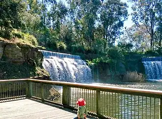 The lake's water jets help with water aeration, whilst also providing a visual and auditory perspective. A major attribute of the reserve is the exposed sandstone rock face, formed during quarrying operations, when the site was used for brick making. Part of this cliff is used for a large (artificial) waterfall and is a conspicuous attraction in the park.[7]