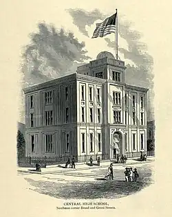 In November 1839, Alexander Dallas Bache, great-grandson of Benjamin Franklin, and Professor of Natural Philosophy and Chemistry at the University of Pennsylvania, was elected the first President of Central High School.[9] President Bache resigned in 1842 to return to his professorship at the University of Pennsylvania, and was succeeded by John Seely Hart, who had been a professor of languages at Princeton University.[8]