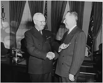 The activation ceremony of this intelligence agency two days later, on 24 January 1946, involved the President of the United States of America, Harry Truman, calling Rear Admiral Sidney Souers and Fleet Admiral Willian D. Leahy to the White House, and presenting them both with black cloaks, black hats, and wooden daggers, before reading aloud the Presidential directive outlining their new duties.[4] The playful attitude of the President in standing up the CIG indicated the Administration's desire that US intelligence remain small during peacetime, and not become again a behemoth agency like it had been during the war.[4] Souers and Truman agreed at this stage that CIG should be a small group, composed of members assigned by the military Departments, and to be operated as a cooperative interdepartmental activity.[7]