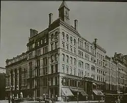 The idea for Central Music Hall was conceived by George B. Carpenter, a local promoter of concerts and lectures.[1] Carpenter was a member of Reverend David Swing's popular nondenominational Central Church, and he imagined a building to be named in its honor that would provide a home for the church and also feature a concert hall, stores, and offices.[1] Construction began in the Spring of 1879 and the auditorium (not yet fully complete) opened on December 5, immediately becoming the city's premier auditorium.[1] It was the first significant music hall to be built following the Great Chicago Fire of 1871.[2] The mixed-use building included a theater, six stories of office space and street-level storefronts.[3]