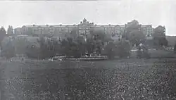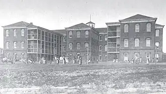 In 1885, the patients from Howard's Grove were transferred to a newly built red-brick hospital trimmed with gray granite. It had a central four-story administration building flanked on either side by a three-story wing containing six wards. This arrangement, which is known as the Kirkbride Plan, was a symbol of moral treatment. The East and West Buildings were built on either side of the main building in 1890 and 1892 to treat more severe cases.