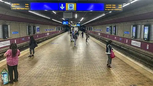 The station has a 125-metre-long (410 ft) centre loading platform that can accommodate two five-car LRT trains at the same time, with one train on each side of the platform. At just under 8 m wide (26 ft), the platform is narrow by current Edmonton LRT design guidelines. Access to the platform is from the concourse level by stairs and escalators located at each end of the platform. The concourse level is part of the Edmonton pedway system.[5]