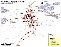 The Centralia mine fire extended beneath the village of Byrnesville, a short distance to the south, and required it also to be abandoned.[25]