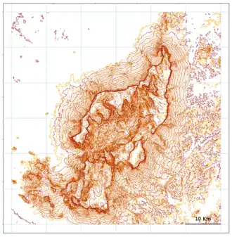 Cerro de la Neblina is sometimes referred to as the Neblina Massif,[12][13] though this term may also encompass Cerro Aracamuni and Cerro Avispa (a grouping of mountains more precisely known as the Neblina–Aracamuni Massif).[4] The Neblina–Aracamuni Massif has a total summit area of roughly 473 km2 (183 sq mi) and an estimated slope area of 1,515 km2 (585 sq mi), of which Cerro de la Neblina accounts for 235 km2 (91 sq mi) and 857 km2 (331 sq mi), respectively.[4]
