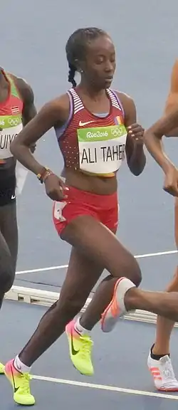 The country's sole female athlete at the 2016 Games was Bibiro Ali Taher, who competed in the 5000 metres.[7] She participated on 16 August in the second heat of the competition.[12] Taher was towards the back of the field as she passed the line on her second to last lap, when she heard the bell indicating the final lap. This was not meant for her, but instead for runners who were a full lap ahead of her. She mistakenly thought the bell indicated that it was her final lap, and so pulled up after another 400 metres.[7] As such, she did not finish her race.[12] She later said in an interview, "I gave everything I could. I worked like crazy these past twelve months. I have no regrets, but I had tears in my eyes because I wanted to leave Rio with a new record."[7]