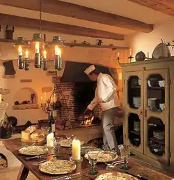 The chalet's interior design dates from the 1950s, and has been largely retained.[7][8][9] The drawing room has a central pillared stone log fireplace leading onto an oak beamed and paneled dining room. The second dining room is equipped with the original wood fired oven.[10][11] Most rooms have their own balconies and terraces with views of the Gotschna mountainous region.[12] In 2006 Tom Robbins described the chalet as "the poshest pad in the Alps".[13] The chalet overlooks the village of Klosters,[14] described by Harper's Bazaar as "the ski resort beloved of the royal family".[15]