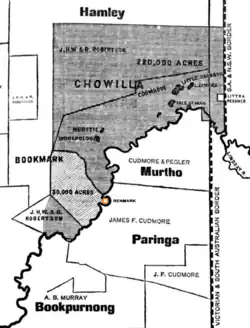 - He sold much of his landholdings in 1863, so avoiding losses in great drought. He sold Bookmark and Chowilla[31] to Richard Holland, who five years later passed them on to his stepsons William and Robert Robertson. In 1887 the South Australian government resumed part of Bookmark for the Chaffey brothers' irrigation development and the town of Renmark.[32]