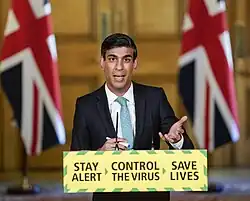 On 17 March 2020, Sunak introduced a programme providing £330 billion in emergency support for businesses,[27] as well as a furlough scheme for employees. This was the first time a British government had created such an employee retention scheme.[28][29] The scheme was introduced on 20 March 2020 as providing grants to employers to pay 80% of a staff wage and employment costs each month, up to a total of £2,500 per person per month.[29] The cost has been estimated at £14 billion a month to run.[30] The Coronavirus Job Retention Scheme initially ran for three months and was backdated to 1 March. Following a three-week extension of the countrywide lockdown the scheme was extended by Sunak until the end of June 2020.[31][32] At the end of May, Sunak extended the scheme until the end of October 2020. The decision to extend the job retention scheme was made to avoid or defer mass redundancies, company bankruptcies and potential unemployment levels not seen since the 1930s.[33] After a second lockdown in England on 31 October 2020, the programme was further extended until 2 December 2020,[34] this was followed on 5 November 2020 by a lengthy extension until 31 March 2021.[35] On 17 December 2020, the programme was further extended until 30 April 2021.[36] In the 2021 budget held on 3 March 2021, Sunak confirmed that the scheme had been extended once more until 30 September 2021.[37]
