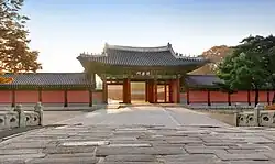 Gate to Injeongjeon[79] and a Treasure.[82] There is no record of when it was built, but it is presumed to have been completed around the time of the palace's founding.[79] It was destroyed in 1592 and rebuilt during the reign of Gwanghaegun.[79] It burned down in 1744 and was rebuilt in 1745;[83] this version has persisted until the present.[63] The gate and corridors were restored to their pre-colonial states from 1992 to 1996.[84] |