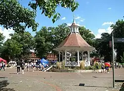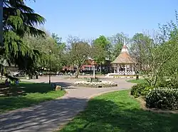In 1852 the Waterworks Company agreed to give up their lease in exchange for the city corporation laying out the land as a public garden.[1] This unofficially made the gardens a park.[2] After an elaborate plan by the company, which included a central pond and the water tower being turned into a gazebo, was simplified in favour of a cheaper option with intersecting avenues,[4][1] the Prince and Princess of Wales planted a Wellingtonia in 1866, marking the council's agreement to lay out the gardens. In 1867, a drill hall and an iron palisade to enclose the site were both erected, and replacement planting in the elm avenues took place, with several dignitaries also planting specimen trees.[1] A 40-ton pagoda made of cast and wrought iron, designed by Thomas Jekyll[5] for the 1876 Philadelphia Exhibition[2] and created by Barnard, Bishop & Barnards, later known as the pavilion and now the site of a refreshment building, was erected[1] after being bought by the Norwich Corporation. During its existence, the pagoda exhibited products made by Barnard's as well as designs by Jekyll.[5] A polygonal bandstand was added in 1880,[2] and children's play area were added by 1899.[1] In the early part of the 20th century, the walks which were somewhat elaborate and serpentine were simplified, and a refreshment pavilion was built. The pagoda was restored.[1]