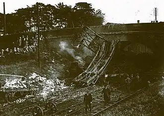 In the aftermath of the collision, as in earlier railway crashes at Quintinshill, Hawes Junction and Thirsk, a fire broke out. It is believed that the gas cylinders of the first four cars were punctured and a cloud of gas quickly formed under the bridge and a fire broke out. Although many likely perished in the collision, it seems likely that the majority of the 14 passenger fatalities were due to the fire.