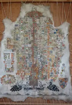 High up on one wall in the Tudor great hall is the 1680 painting Captain Thomas Lucy by Sir Godfrey Kneller, dated 1680. It includes what is believed to be one of the earliest depictions of an enslaved black presence in the West Midlands. The painting includes a young black groom in the right hand background, dressed in a blue livery coat and red stockings and wearing a gleaming, metal collar around his neck. The National Trust notes that "It is not known if Kneller painted this unidentified figure from a model or if it is a portrait of a real groom in Captain Lucy's household".[5]