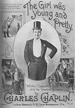 Chaplin toured America in the summer of 1890, including extended engagements at the Union Square Theatre in New York City.[12] Although he never reached the height of stars like Dan Leno and Herbert Campbell, Chaplin was successful enough to have his name and portrait printed on the cover of sheet music for songs with which he was associated.[13] One of the songs he popularised was 'The Girl Was Young and Pretty'.[14]