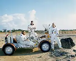 Duke feared that he might not recover in time for the launch, which was scheduled for March 17, 1972.[62] The spacecraft and Saturn V launch vehicle had already been rolled out to Launch Pad 39A on December 13.[63] Luck was with Duke: Grumman engineers wanted more time to test the increased capacity of the LM's batteries; a fault was found with the explosive cords that separate the LM from the CSM that warranted their replacement; and a failure of a clamp in Duke's spacesuit during training required the modification of all three astronauts' suits. This caused the launch date to be postponed to the next launch window, on April 16.[64][65] This proved fortunate when an error by launch pad technicians caused one of the CM's Teflon fuel tank bladders to rupture, and the entire space vehicle had to be returned to the Vehicle Assembly Building.[66][67] Slayton noted that "there wasn't even any discussion of replacing him; that was one of the lessons we'd learned on 13."[68]