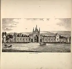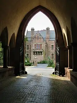 View from the cemetery's main gate toward the Stirling mansion, 2020