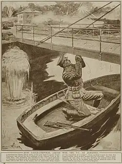 At the outbreak of World War I he was recalled to service. He was 33 years old, and a lance-corporal in the 57th Field Company, Royal Engineers, British Army during the First World War when the following deed took place for which he was awarded the VC.