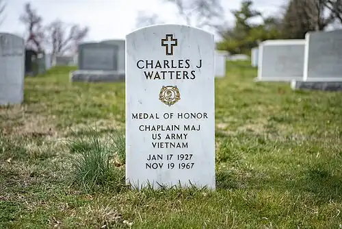 On November 19, 1967, Chaplain Watters' unit was involved in close combat with the enemy in the vicinity of Đắk Tô. For his "conspicuous gallantry ... unyielding perseverance and selfless devotion to his comrades" on that day, Chaplain Watters was posthumously awarded the Medal of Honor by Vice President Spiro Agnew in a ceremony that also honored John Andrew Barnes III and Robert F. Stryker.[3] Watters is buried in Arlington National Cemetery.[4]