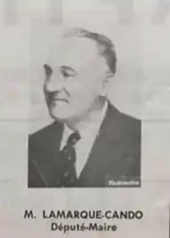 Lamarque-Cando won his first political office in the February 1936 cantonal elections with 62 percent of the vote, and immediately planned to contest the 1936 French legislative elections. He received 47 percent of the vote, and was not seated to the Chamber of Deputies. He was, however, reelected a general councillor representing Sabres in October 1937. In 1941, Lamarque-Cando organized a group of French Resistance members in Mont-de-Marsan affiliated with Libération-Nord. Among its membership was Marcel David. While allied with the French Forces of the Interior, Lamarque-Cando worked within a network led by Maurice Buckmaster of the Special Operations Executive. Lamarque-Cando was awarded the Resistance Medal and the Croix de Guerre 1939–1945 for his actions during World War II. His political career resumed after the war, as he returned to the Sabres seat on the general council, and chaired the body from September 1945 to April 1949.[1]