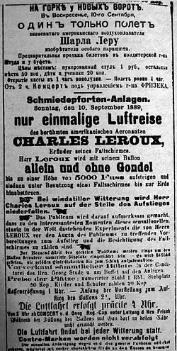 Flyer to advertise Leroux's parachute jump in Tallinn (Revalsche Zeitung, September 1889)