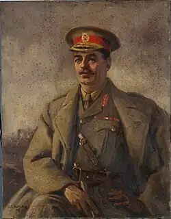 In England attending the Staff College at Camberley when the First World War broke out, Melvill returned to his former unit, the South Lancashire Regiment.[2] He embarked for the Western Front in August as part of the "Old Contemptibles" and was wounded the following month. After recovering from his wounds, he was posted to the School of Instruction, Westminster Command, as chief instructor. He then served as brigade major for the Tay Defences from May to September 1915 before transferring to the New Zealand Expeditionary Force (NZEF), which at the time was engaged in the Gallipoli campaign.[1] Initially a staff officer, he served under Brigadier General William Braithwaite as brigade major of the New Zealand Rifle Brigade following the evacuation of the Allied forces from Gallipoli in December.[1][4][8]