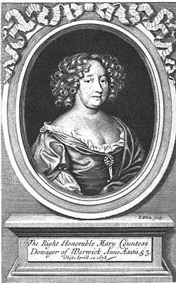 Rich was the second son of Robert Rich, 2nd Earl of Warwick and Frances Hatton. As a young man, he was noted for being handsome, charming, cheerful and penniless. His wife was Lady Mary Boyle, daughter of Richard Boyle, 1st Earl of Cork, and his second wife Catherine Fenton. He became intimate with Lady Mary when he helped to nurse her through an attack of measles.[1] It was a love marriage: Mary to her father's intense displeasure, had refused to enter the marriage arranged by him with James Hamilton, later Earl of Clanbrassil, on the grounds that she found him repulsive, and chose Charles instead. Her father who was genuinely fond of her despite their differences eventually gave his consent, as well as a generous dowry, but the couple do not seem to have been happy. Mary in her diaries refers to "violent and passionate disputes". There may have been faults on both sides, since Mary was exceptionally stubborn and strong-minded (as shown by her defiance of her formidable father), and in later years became almost fanatically devout, but it was generally agreed that the greater blame lay with Rich, whose chronic ill-health made him bad-tempered and tyrannical.