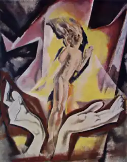 Abandoning portraiture and representational painting altogether, Sims embarked on the final phase of his creative career, which resulted in a series of paintings that would be termed the Spiritual Ideas. They depict visually smeared and abstracted maelstroms of cosmic energy in which naked and contorted figures are overwhelmed by gigantic, personified forces; their enigmatic content and Sims' apparent turn to a modernist style startled and confused the artistic establishment. Critics likened the paintings to the works of El Greco,[22] William Blake,[23] Wassily Kandinsky,[17] and the Italian Futurists.[24]