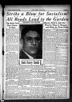 Solomon continued to stand as a Socialist candidate for office on many occasions. During the 1920s, he ran for Lieutenant Governor of New York in 1924; for the Assembly again in 1927;[5] and for Justice of the New York Supreme Court in 1928. In the 1930s, he stood for the New York State Senate (8th District) in 1930; for U.S. Senator from New York in 1932; for Mayor of New York City in 1933; and for Governor of New York in 1934.[6] He left the Socialist Party and joined the American Labor Party in 1936, running again for the New York Supreme Court in 1938 and for Kings County District Attorney in 1939. He later co-founded the Liberal Party of New York.[7]