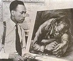 In 1940, White stated in an interview, "I am interested in the social, even the propagandistic angle of painting that will say what I have to say. Paint is the only weapon I have with which to fight what I resent."[14] In 1938, White was hired by the Illinois Art Project, a state affiliate of the Works Progress Administration. His work received an extended showing at the Chicago Coliseum during the Exhibition of the Art of the American Negro, which was part of the American Negro Exposition commemorating the 75th anniversary of Thirteenth Amendment ending slavery.[15] An important figure in what became known as the Chicago Black Renaissance, White taught art classes at the Southside Community Art Center.[6] Following his first show at Paragon Studios in Cincinnati in 1938, White's work was exhibited widely throughout the United States, including, among many others, exhibitions at the Roko Gallery, the Boston Museum of Fine Arts, and the Whitney Museum of American Art. In 1939 he produced his WPA mural Five Great American Negroes, now at Howard University Gallery of Art.[11] White also showed at the Palace of Culture in Warsaw and the Pushkin Museum. In 1976 his work was featured in Two Centuries of Black American Art, LACMA's first exhibition devoted exclusively to African-American Artists.[16]