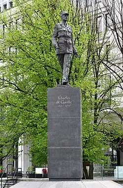 The Charles de Gaulle Monument,[a] also known as the Statue of Charles de Gaulle,[b] is a monument in Warsaw, Poland, in the Downtown district placed near the Charles de Gaulle Roundabout, and in front of the Banking and Financial Centre building. It consists of a bronze statue of Charles de Gaulle, a military officer and statesman who led the Free French Forces against Nazi Germany in World War II, and served as the president of France.