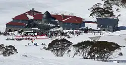 Skiing in Australia had begun some six decades earlier at Kiandra in the Northern Snowy Mountains, but the first Kosciuszko Chalet built at Charlotte Pass in 1930 gave relatively comfortable access to Australia's highest terrain.[11] At 1760m, Charlotte Pass has the highest village base elevation of any Australia ski resort and can only be accessed via over-snow transport in winter.[12] The growing number of ski enthusiasts heading to Charlotte Pass led to the establishment of a cafe at Smiggin Holes around 1939, where horse-drawn sleighs would deliver skiers to the start of the arduous ski to the Kosciuszko Chalet.[13] It was the construction of the vast Snowy Mountains Hydro-Electric Scheme from 1949 that really opened up the Snowy Mountains for large scale development of a ski industry and led to the establishment of nearby Thredbo and Perisher as leading Australian resorts.[14][15] Kosciusko Alpine Club was the first ski club to build its own lodge here in 1952, having occupied the Chalet earlier. Other club lodges were built soon after.